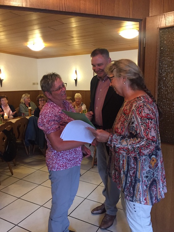 Zum Mittagessen in der Gaststätte Deppe bei Schnitzel satt war Frau Annelore von Hof stellvertretend für die Stadt Duderstadt und Ralf Regenhardt als Caritasvorstand gekommen, um die Ehrenamtlichen einzeln mit einer Ehrenurkunde und einem kleinen Geschenk zu verabschieden. Was wäre eine solche Urlaubswoche ohne all das bürgerschaftliche Engagement im Fahrdienst, in der Begleitung der Kleinbusse und im Küchendienst aber auch Gottesdienstgestaltung. Für dieses Engagement bedankten sich die Stadt, die Gemeinde und der Caritasverband mit einem Erinnerungsanhänger von Urlaub ohne Koffer 2018.