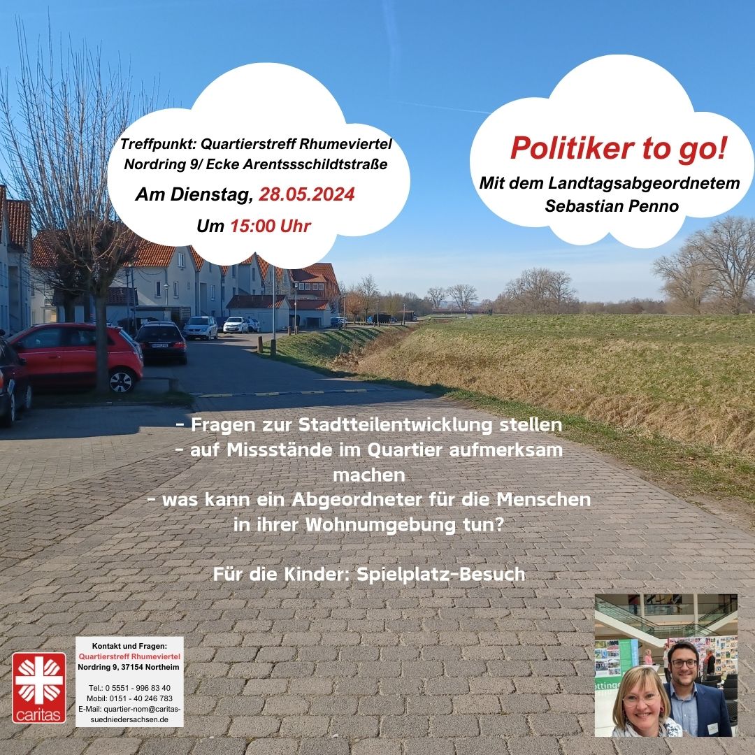 Die Veranstaltungsreihe im Quartierstreff Rhumeviertel setzt sich am Dienstag, 28. Mai, um 15 Uhr fort. Unter dem Motto „Politiker to go!“ ist ein Stadtteil- Spaziergang mit dem Landtagsabgeordneten Sebastian Penno geplant.